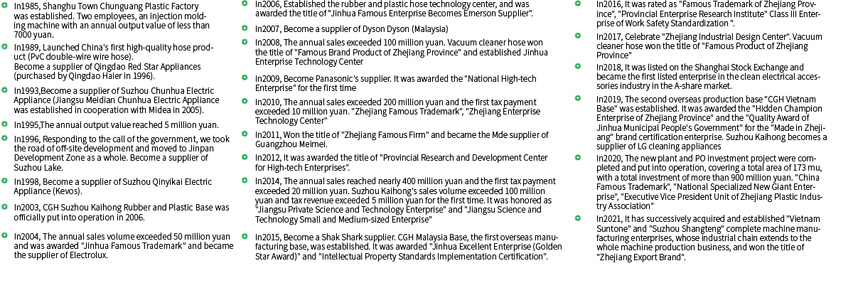 Chunguang technology always takes "to be professional, refined and strong, to build a national brand with world influence" as its enterprise goal. Since the introduction of China's first high-quality hose in 1989, more than ten series and hundreds of products have been independently developed, including central vacuum cleaner hose, blow molding hose, winding hose, extrusion hose, blister hose, conductive hose, etc. In the past ten years, the sales volume and market share of vacuum cleaner hose produced by the company ranked first in the same industry in China. For three consecutive years, the main economic indicators and product quality ranked first in the similar products of plastic industry in Zhejiang Province. The company's self-developed integrated extrusion tube forming equipment, telescopic tube automatic rotary inkjet equipment, multi-functional conductive composite hose production equipment, high-strength central vacuum hose forming technology, etc. have filled the industry gap. Independently developed 1: 8 super large expansion ratio hose, the technical indicators have reached the international leading level. The company's hose and accessories products are mainly used in the field of cleaning electrical appliances such as vacuum cleaners, and have gradually extended to the fields of hanging ironing machine, dishwasher and outdoor cleaning industrial dust removal system.